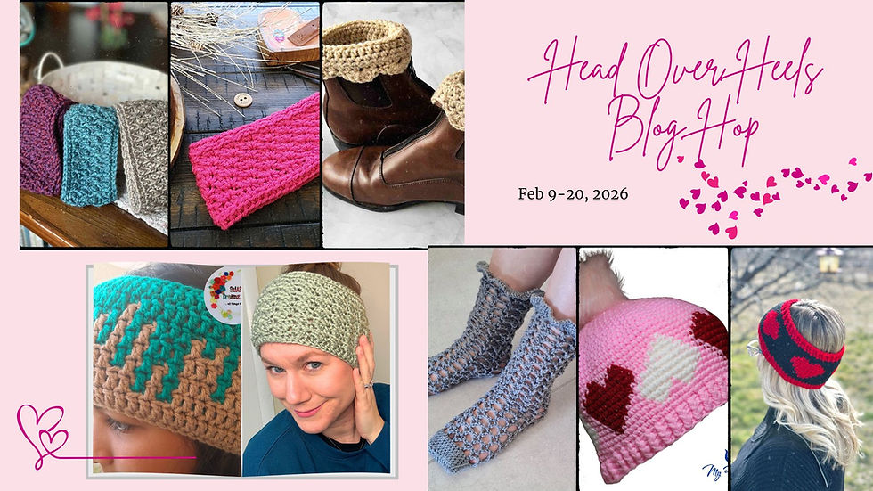 My Pattern - Drip Paint Mosaic Earwarmer is featured on Day 8 of the Head Over Heels Blog Hop - Feb 16th, 2026.